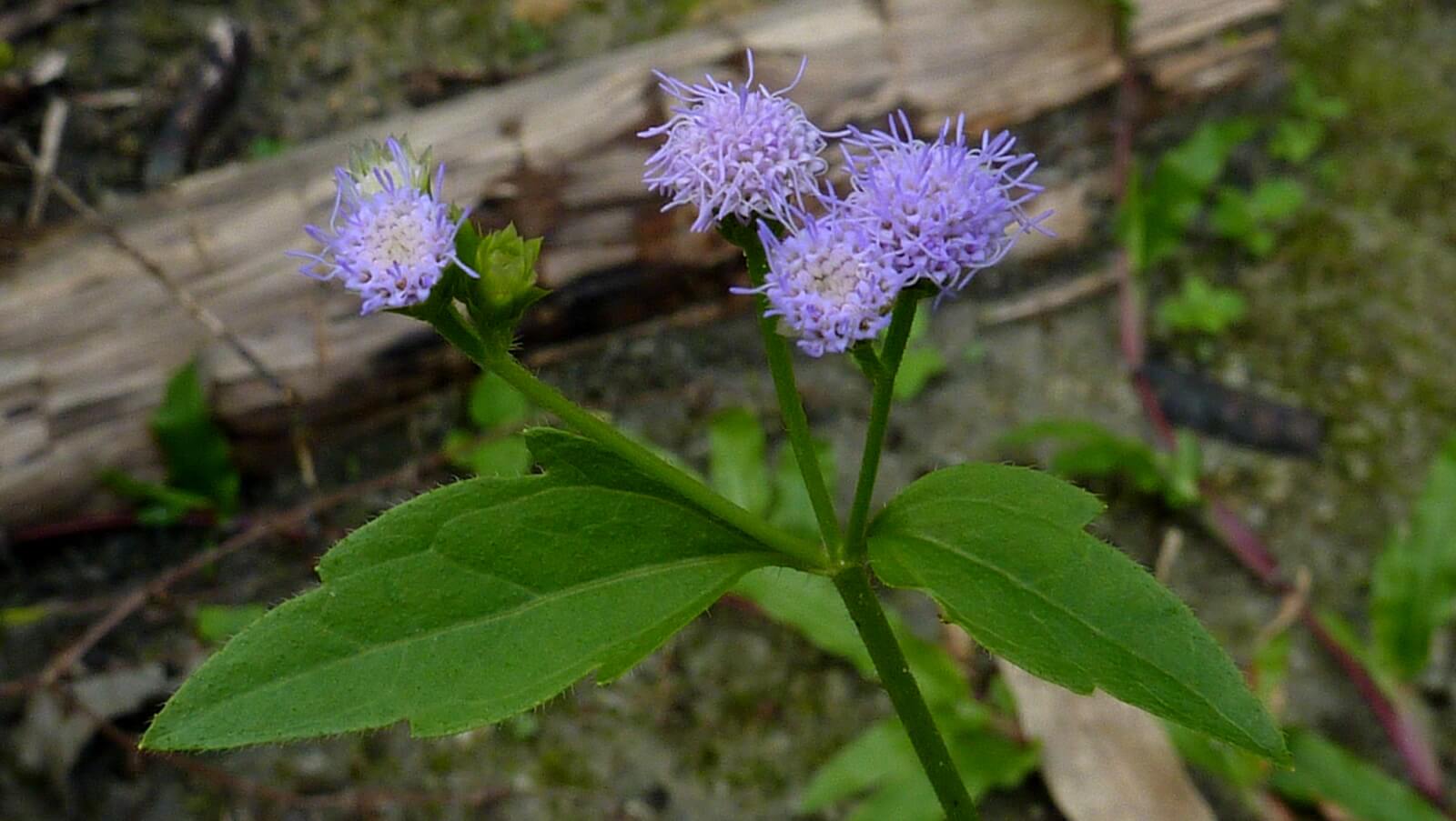 The differences between Praxelis and A. conyzoides are subtle, even to the trained eye. Both have blue flowers, although those on A. conyzoides are often less intense blue and may also be white or pale lilac. Both are covered with hairs, although the hairs on Praxelis are longer and more conspicuous. The main difference is that Praxelis has a conical receptacle for its 'florets', the dense cluster of small flowers that make up the flower head, whereas A. conyzoides has a flat or slightly dome-shaped receptacle. Also, the ring of 'bracts', modified leaves that surround and support the flower head, is deciduous and drops off Praxelis flowers, whereas in A. conyzoides the bracts are persistent. The leaves of Praxelis have a more pungent odour when crushed, and are more triangular and more sharply toothed than those of A. conyzoides, which are more rounded near the tip and have smooth teeth along the edges. Finally, the 'pappus' on Praxelis seeds consists of many more bristles (15-40) than A. conyzoides, which has only about 5 bristles. The flower colour and size of A. houstonianum is usually much closer to that of Praxelis than A. conyzoides, especially in those parts of northern Queensland where the three species occur together (e.g. Atherton Tablelands) (CRC 2003).